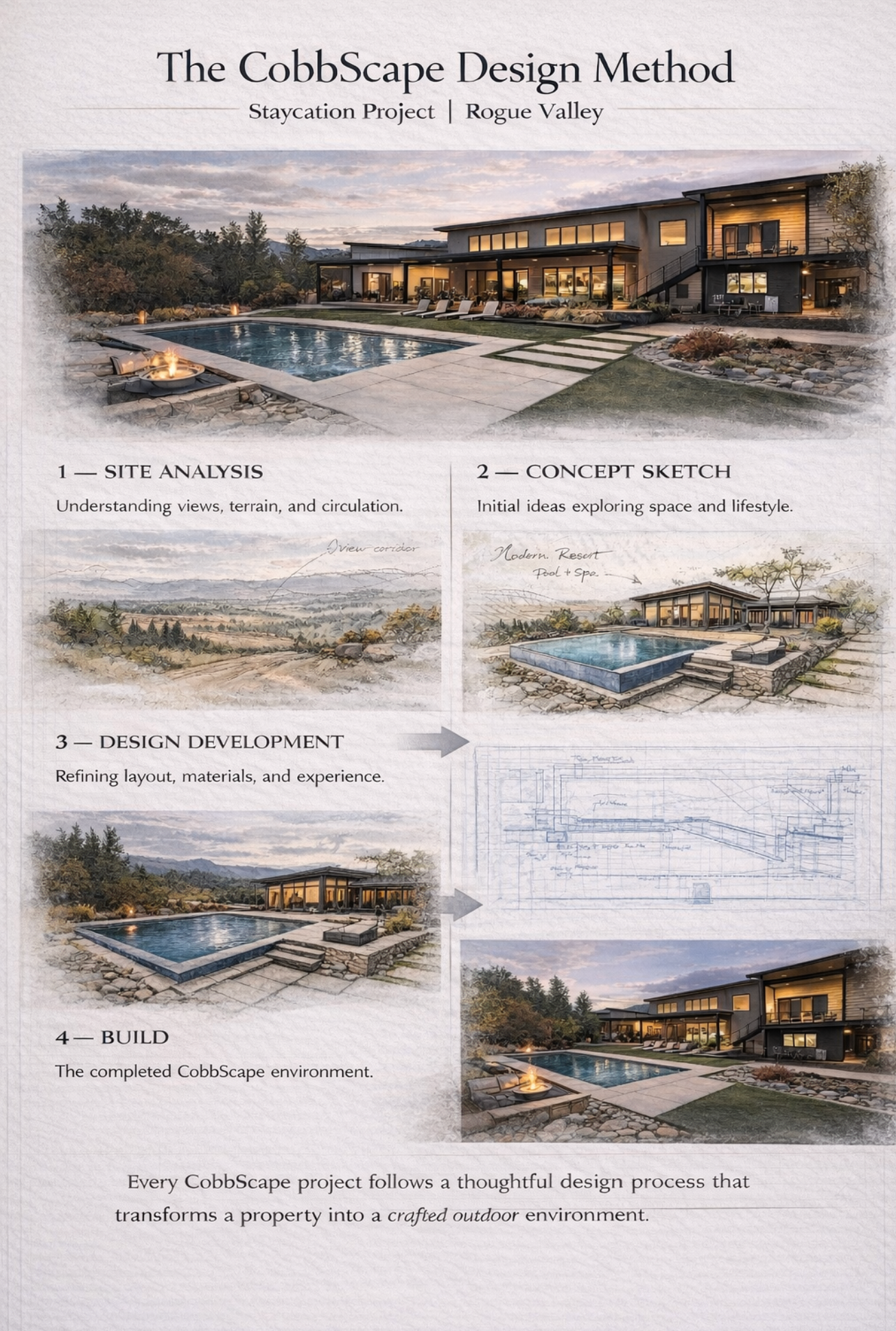 The design balances modern architecture, expansive views, and natural landscape materials to create an outdoor environment that feels both sophisticated and grounded in the beauty of the Rogue Valley.